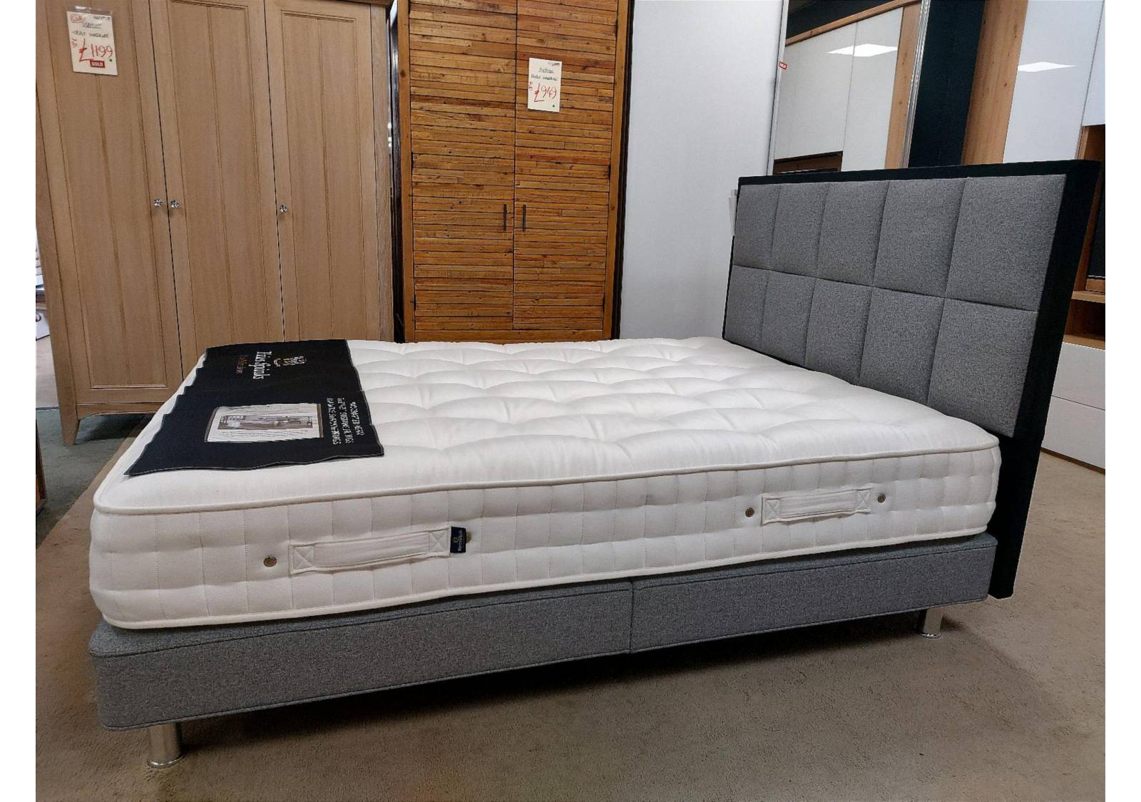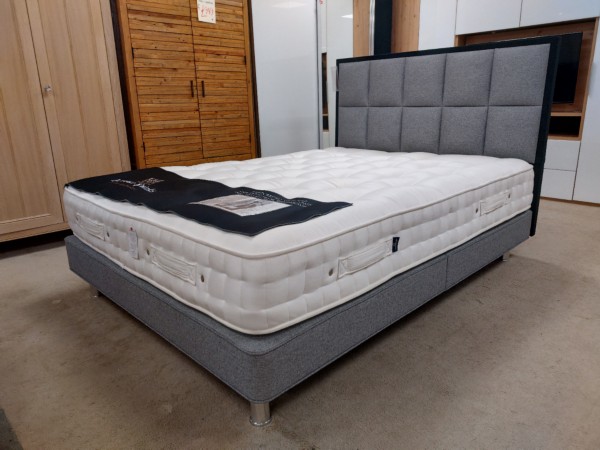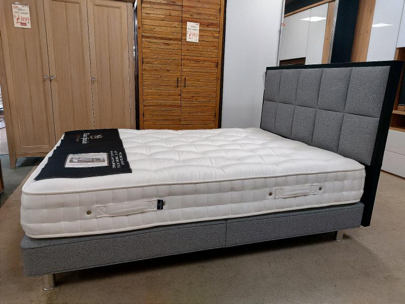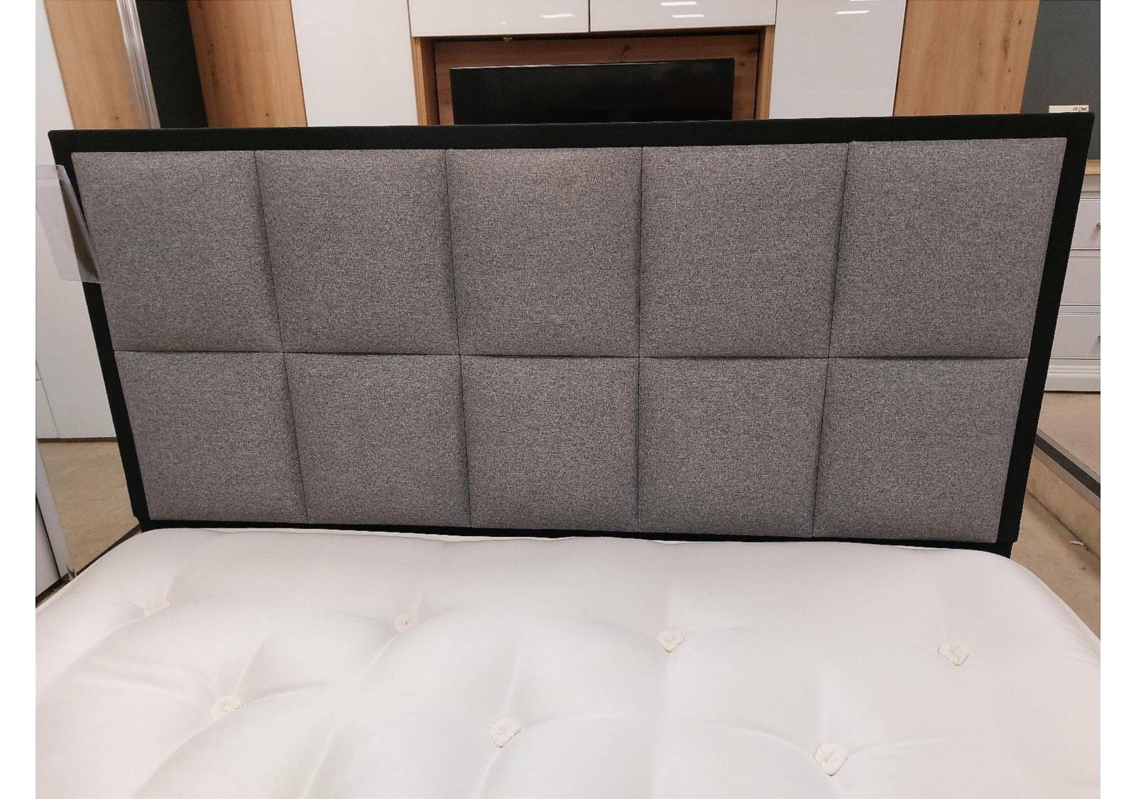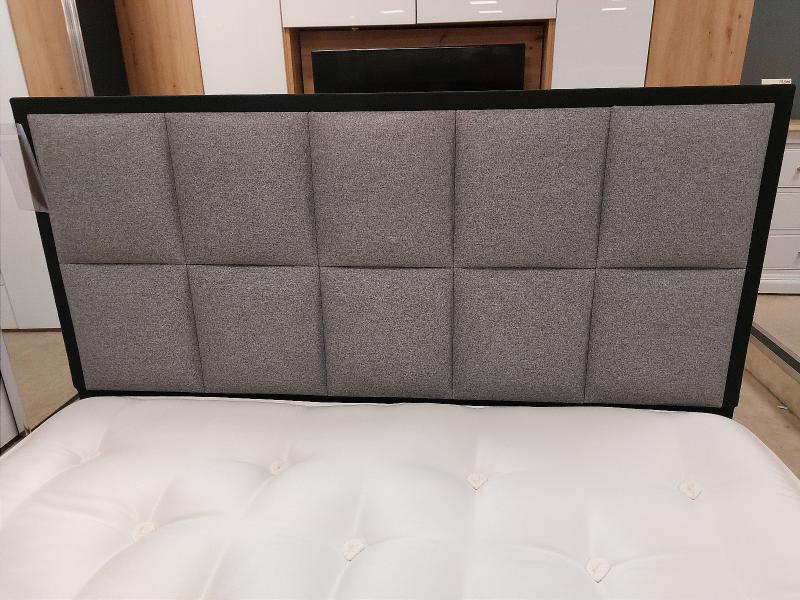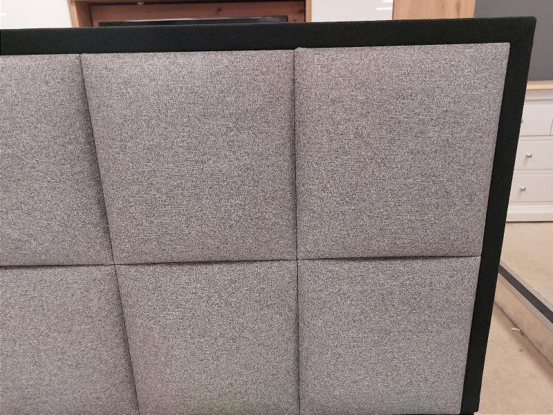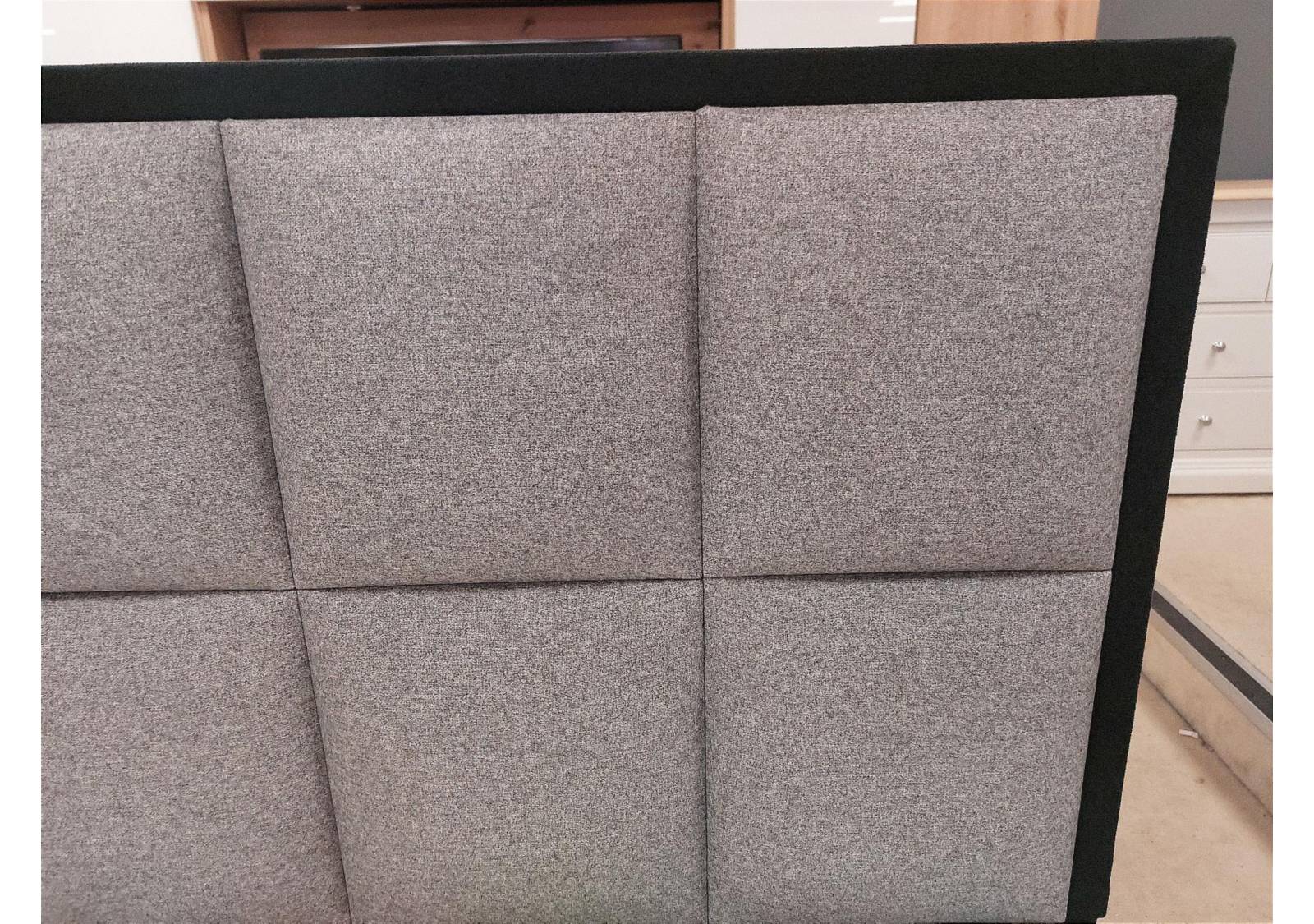 It is paired with a grey divan base with round metal legs and the striking Alexandra headboard, which has two rows of square panels, set within a border upholstered in a contrasting black fabric, making it a unique addition to a modern space!