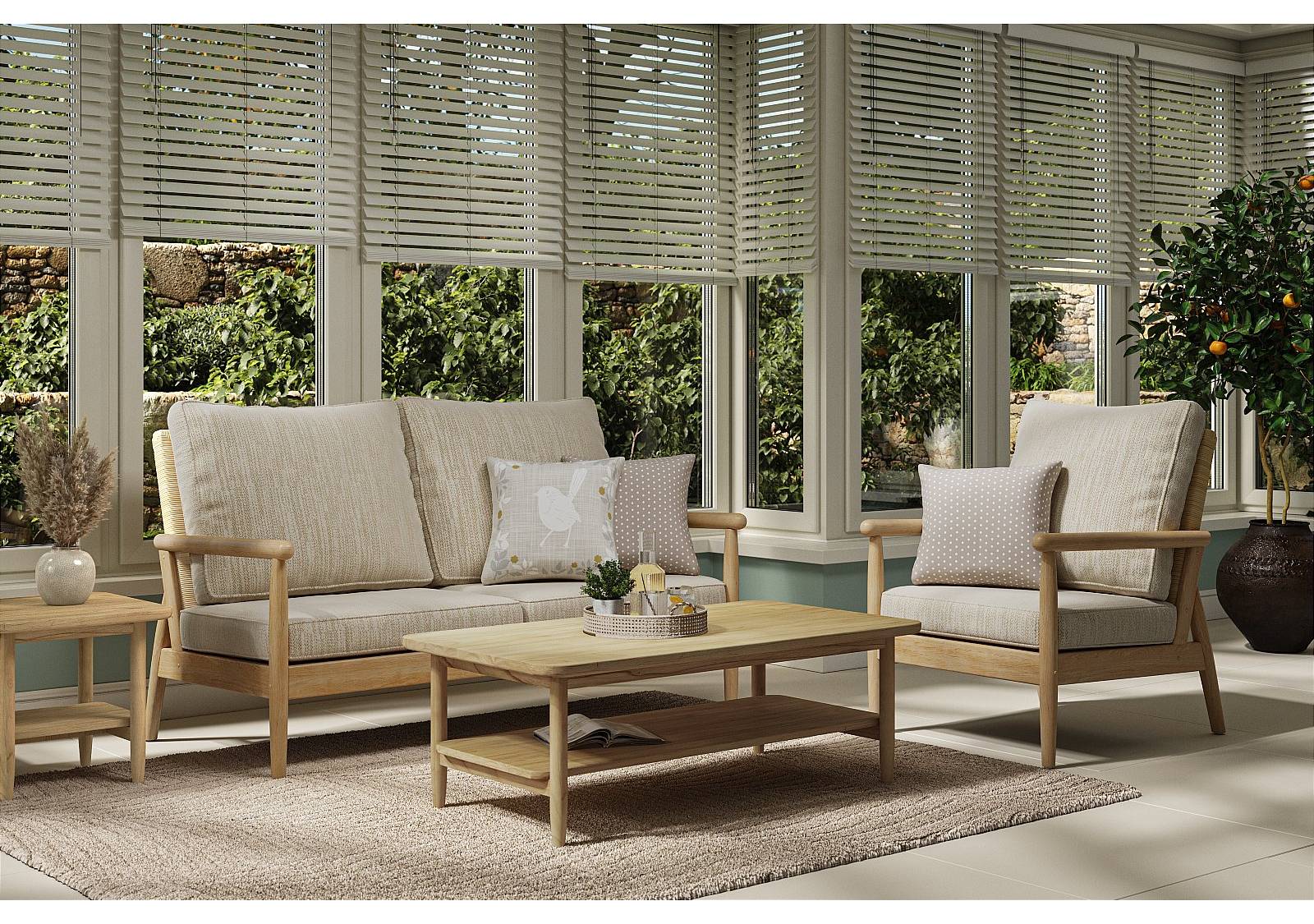 The Dorchester range features sleek Mindi wood frames with rounded wooden arms and handwoven rattan backrests in a light Oak finish. The rounded legs and corners of the side and coffee tables echo the curved design of the arms for a stylish, cohesive collection. With its smooth shaping and clean lines, the Dorchester range is perfect for those looking to create a calm, relaxing conservatory space.